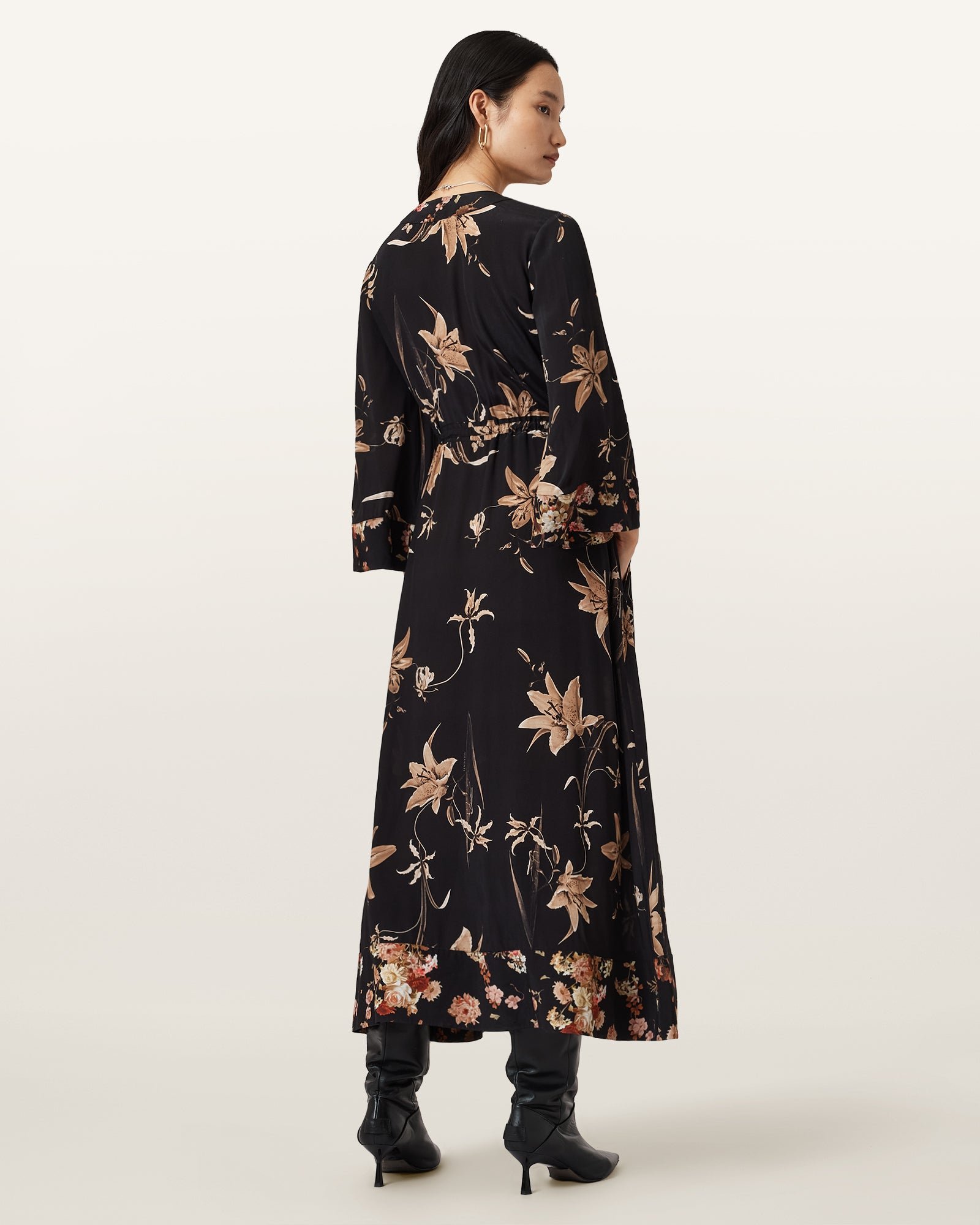 - The DIANA dress, crafted from a man-made fabric, features a lace-up kimono silhouette and a flowing, long length, embodying effortless allure. The floral print adds a touch of femininity to everyday wear, creating a confident and stylish look whether worn alone or paired with boots.