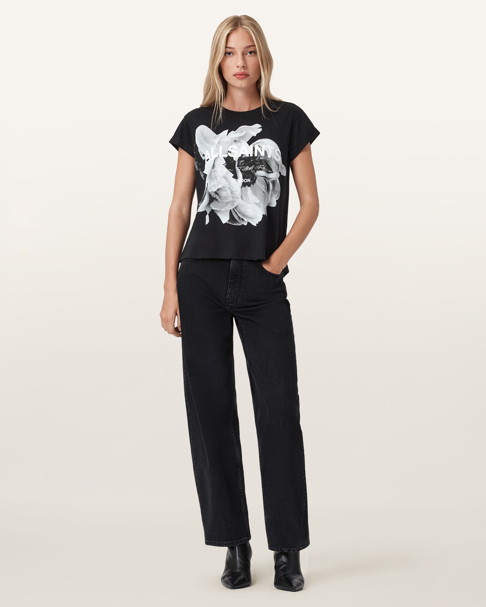 The LENA ANNA short-sleeved T-shirt, crafted from cotton, features hand-painted florals on the all-black fabric, creating a striking look. It pairs perfectly with any leather pants.